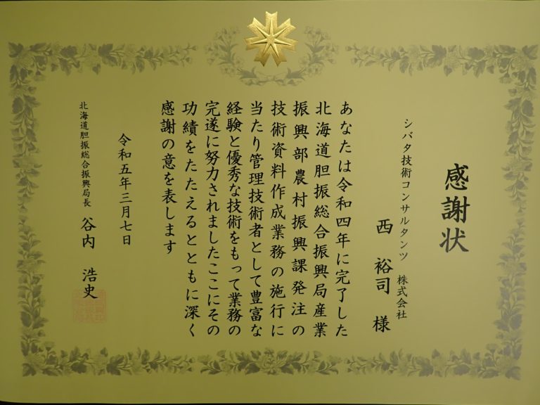 北海道胆振総合振興局より、弊社環境調査部 西裕司が優秀管理技術者として感謝状の贈呈を受けました。